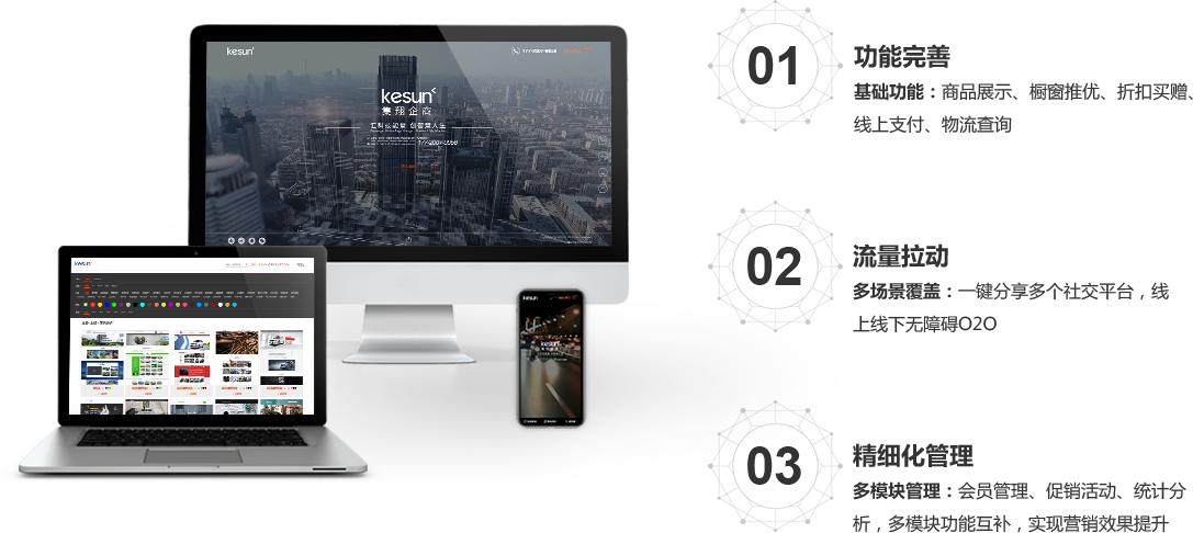 搭建獨立商城系統,輕松開展線上零售業務,為企業打造展示、交易數據管理三大平臺打通O2O場景營銷。